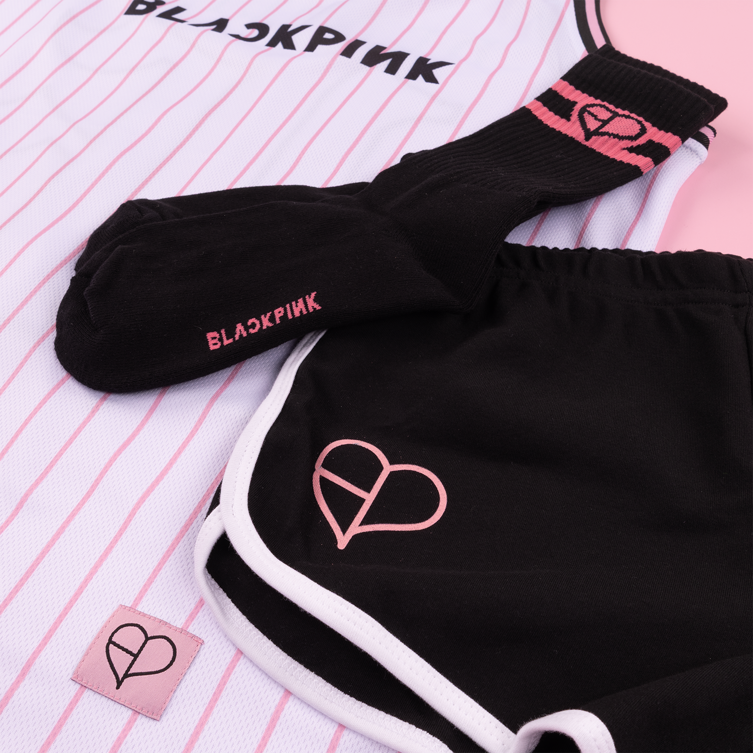 Black athletic crew socks with BLACKPINK printed on the bottom and a heart symbol with stripes printed around the ankle.