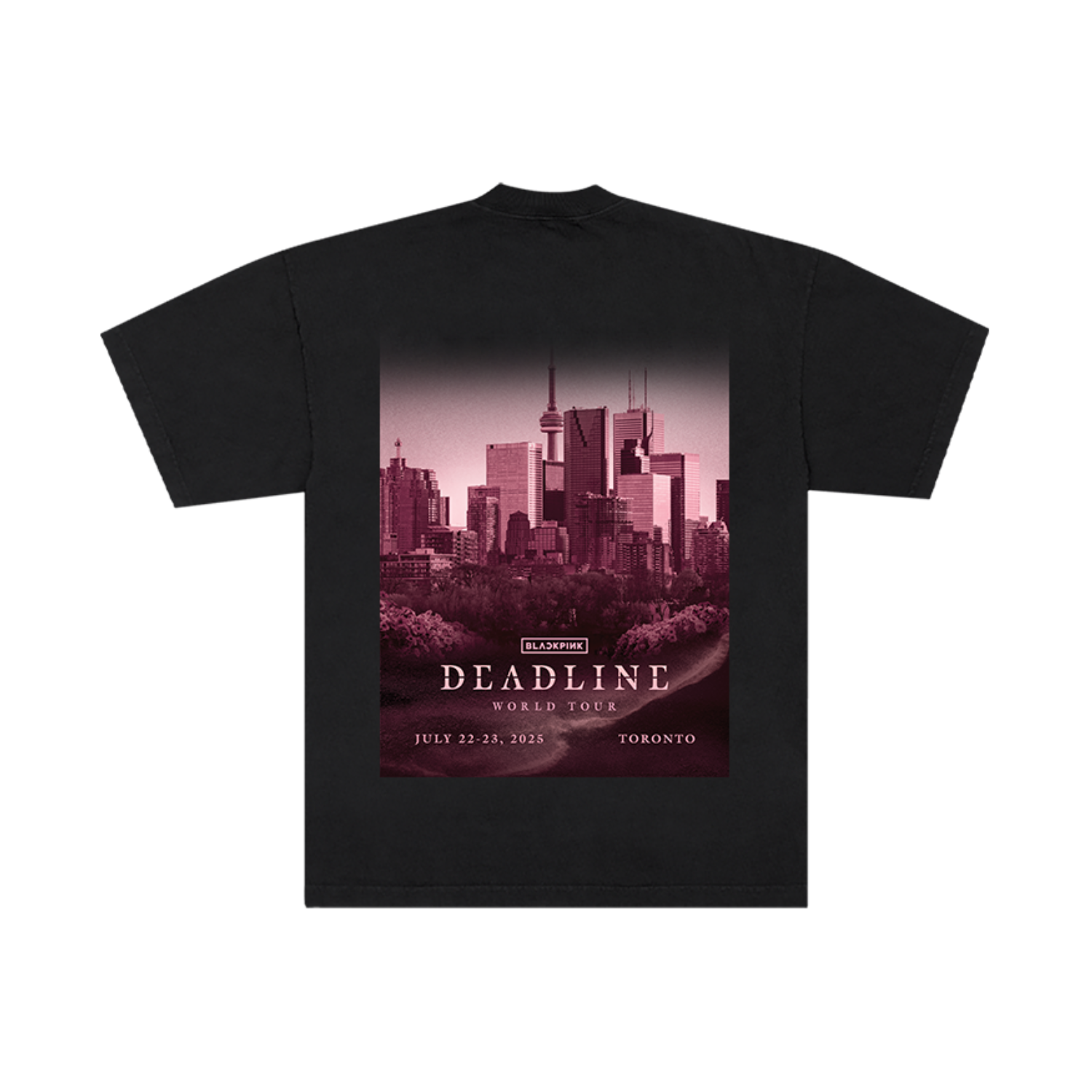 BLACKPINK logo printed on the front and DEADLINE World Tour with Toronto tour dates printed on the back of a black heavyweight unisex tee.