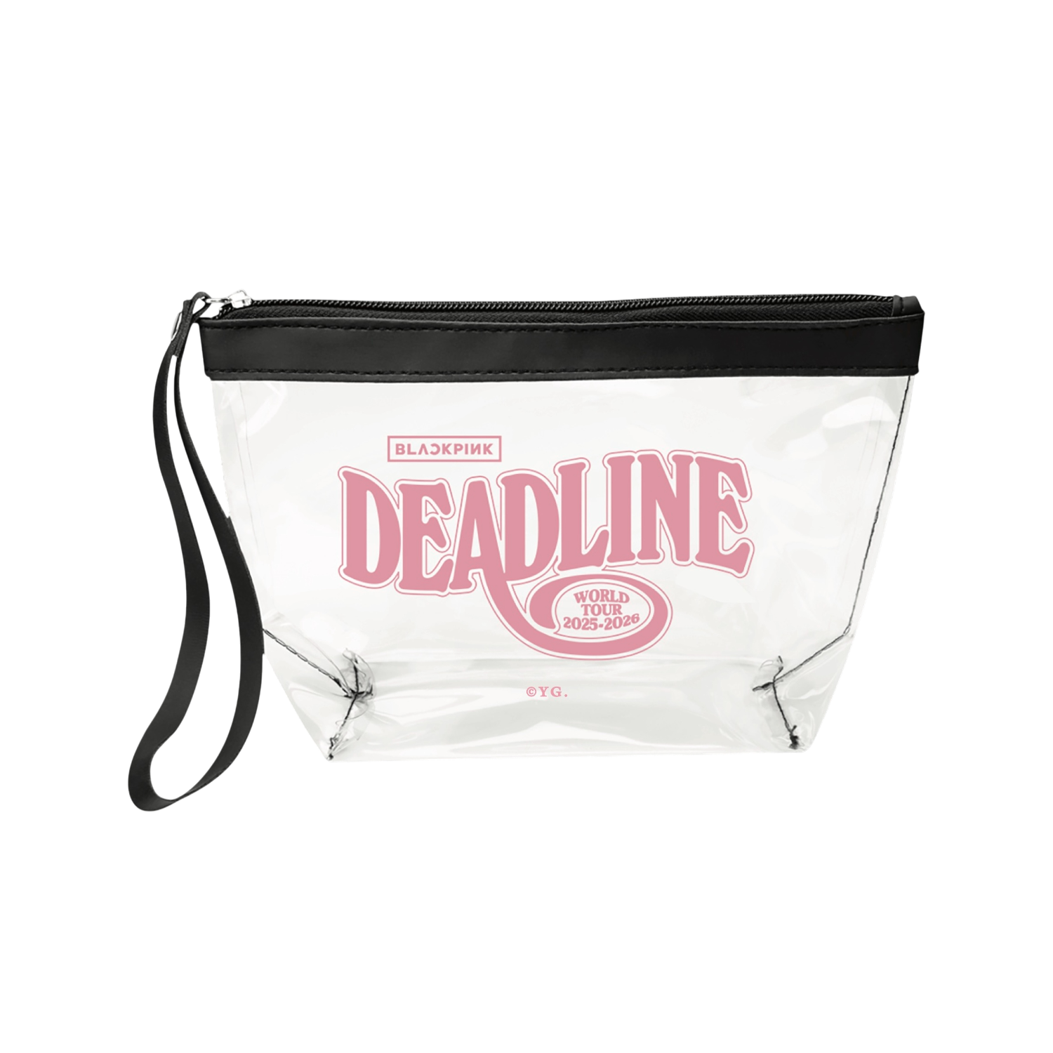 Custom clear PVC pouch featuring a BLACKPINK Deadline World Tour design printed on the front in pink.
