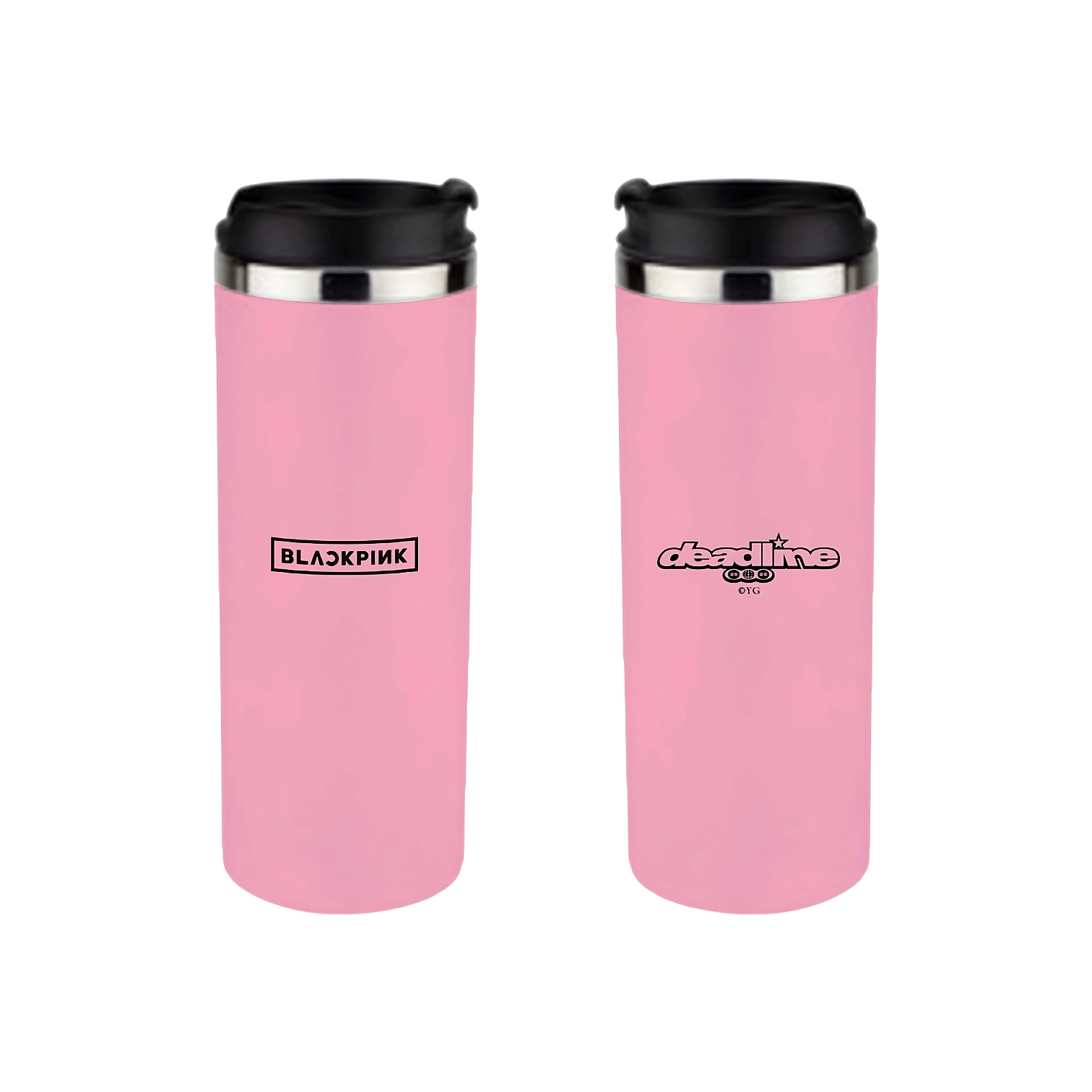 Pink tumbler featuring BLACKPINK printed on one side and a Deadline logo printed on the other side.